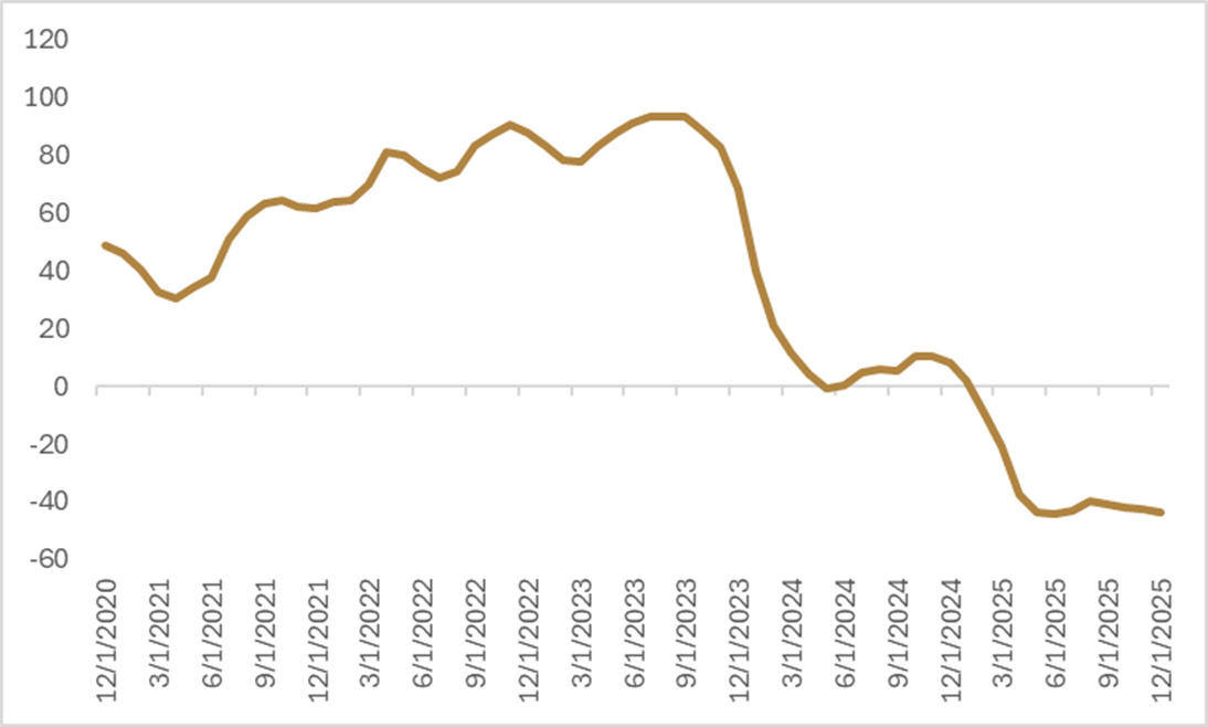 Our view is that copper’s strong 2025 performance has been driven more by a supply-risk premium than by a fundamental upshift in demand growth. Copper is behaving like a market that is paying for reliability—something that has been in short supply. Speculative interest is also beginning to look stretched, approaching the positioning seen in early 2024 when prices pushed toward $11,000 per tonne before a sharp pullback. We remain bullish on copper and industrial metals as a long-term theme, but at current levels we find it difficult to justify adding fresh long exposure with LME copper around $12,500 per tonne. From a risk-reward perspective, we would be more interested in adding on pullbacks—closer to the $10,000 area—than chasing momentum at today’s prices. That said, we continue to see value in maintaining existing exposure. The disruption cycle of 2025 has reinforced that copper supply is becoming structurally less elastic: as mines age, a growing share of capital spending is directed toward sustaining output rather than expanding capacity, leaving the market more vulnerable to shocks.