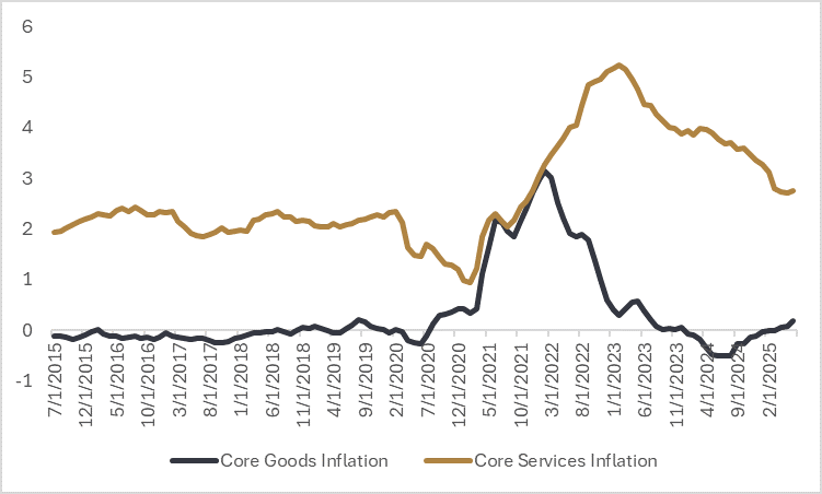 Trade policy uncertainty from earlier in the year is starting to filter into the underlying economic data, with revisions to non-farm payroll gains in the U.S. illustrating hiring stalled for the months of May and June. As noted above, core inflation is indeed moderating, but this is mostly a result of downward pressure on prices for services and we’re starting to see prices for goods trend upward as the effects of tariffs are passed along to U.S. consumers.