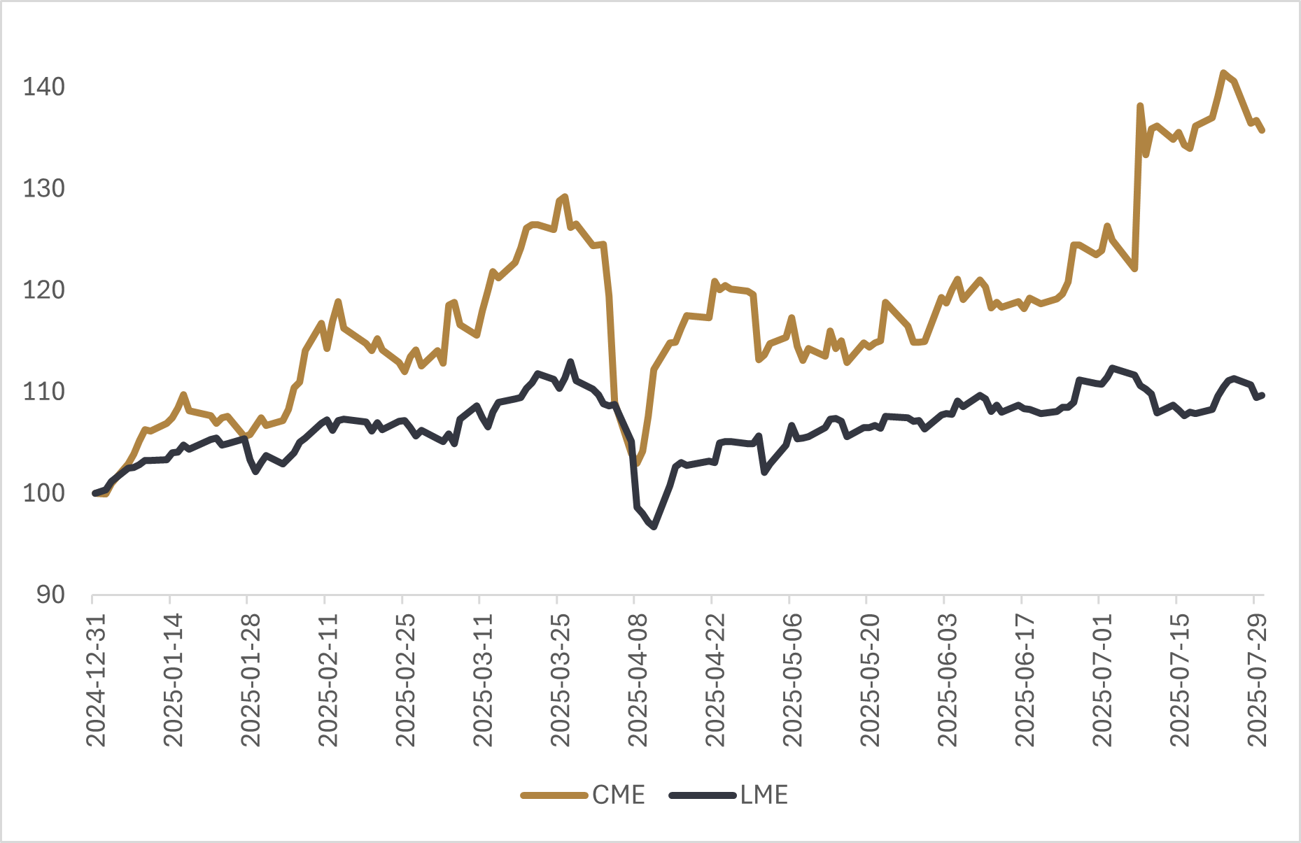 From January 1 to July 30, CME front-month copper rose ~39% vs. ~8% on the LME (a peak ~31% spread). On the afternoon of July 30, the White House limited the 50% tariff to processed products, exempting raw/refined copper (the benchmark futures contracts track) and caused CME futures prices to fall >20% in a day and the CME–LME spread collapsed back to ~zero. While the exemption was economically sensible—the U.S. imports ~45% of its copper, and taxing raw inputs would have added roughly $4.5 billion in costs at current prices—the announcement caused a massive whiplash for copper traders.